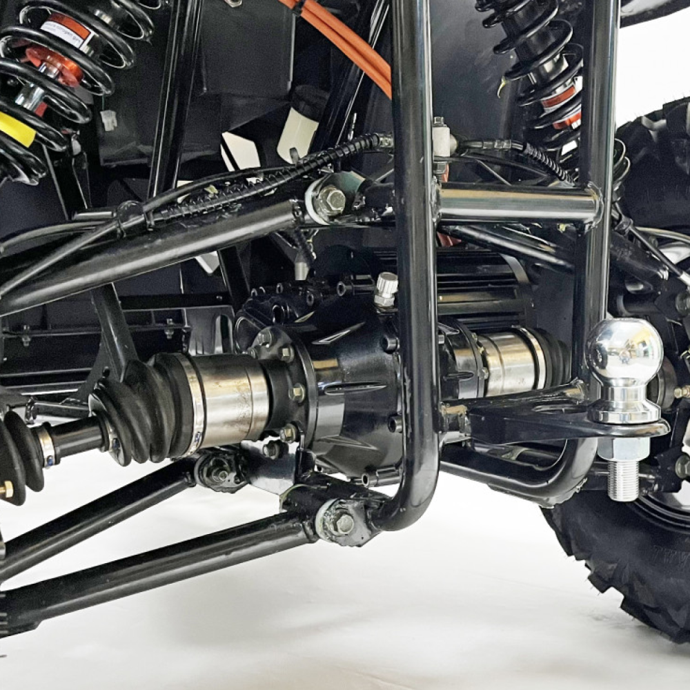 Шасси квадроцикла оснащено дифференциальной передачей, а регулируемые амортизаторы способствуют максимальному комфорту и безопасности при движении по неровной поверхности. Колесные диски из алюминия (R12) в сочетании с высококачественными шинами (25X8-12 спереди и 25X10-12 сзади) гарантируют отличное сцепление с дорогой, а передние и задние гидравлические дисковые тормоза обеспечивают мгновенную и надёжную реакцию при необходимости остановки. Оптимальная высота сиденья в 78 см способствует удобству управления и адаптации под большинство пользователей.