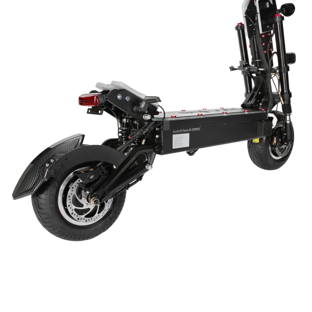 Электросамокат Syccyba Goliaf — полноприводный внедорожник премиум-класса с пиковой мощностью 11000 Вт, максимальной скоростью 110 км/ч, пробегом до 100 км и грузоподъемностью до 150 кг, предназначенный для экстремальной езды по бездорожью.​​