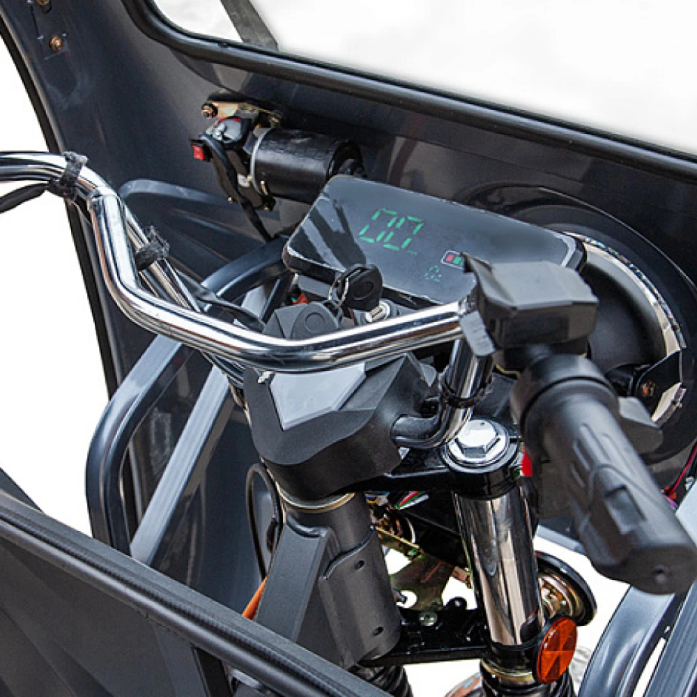 Грузовой электротрицикл Rutrike D5 КАБИНА гидравлика 1700 60V1200W – это высокомощное и надежное транспортное средство, специально разработанное для эффективной перевозки грузов в городских и пригородных условиях. Его конструкция сочетает прочность, функциональность и продуманный комфорт, что делает его незаменимым решением для бизнеса и логистики.Устройство оснащено 1200-ваттным двигателем, работающим при напряжении 60V, что обеспечивает устойчивое ускорение и позволяет достигать максимальной скорости до 25 км/ч. Несмотря на ограниченный пробег до 18 км на одном заряде, эта модель оптимально подходит для локальных перевозок, где важна надежность и точность доставки.Конструкция трицикла впечатляет своими размерами и грузовыми возможностями: вес устройства составляет 395 кг, а максимальная нагрузка достигает 900 кг, что позволяет перевозить значительные объемы товаров. Переднее колесо диаметром 3,75 дюйма и заднее – 4,00 дюйма, способствуют стабильному сцеплению с дорогой и уверенной маневренности даже на сложном рельефе. Габаритные размеры в собранном состоянии – 3200×1200×1770 мм – подчеркивают его внушительный масштаб и практичность при работе в условиях ограниченного пространства.Аккумулятор с емкостью 80 Ah обеспечивает питание на протяжении коротких маршрутов, а время полной зарядки составляет около 8–10 часов. Это позволяет оперативно возвращать транспортное средство в строй после выполнения задач. Дополнительная безопасность обеспечивается надежной барабанной тормозной системой, которая гарантирует эффективное торможение даже при интенсивном движении.Кабина гидравлического типа предлагает комфорт и защиту оператора от неблагоприятных погодных условий, делая работу на маршруте максимально удобной. Кроме того, данный электротрицикл способен преодолевать подъемы с максимальным углом в 15 градусов, что расширяет его эксплуатационные возможности.В итоге, грузовой электротрицикл Rutrike D5 КАБИНА гидравлика 1700 60V1200W – это современное, мощное и функциональное решение для локальной доставки и перевозки грузов, которое сочетает надежность, удобство и продуманную эргономику в одном устройстве.
