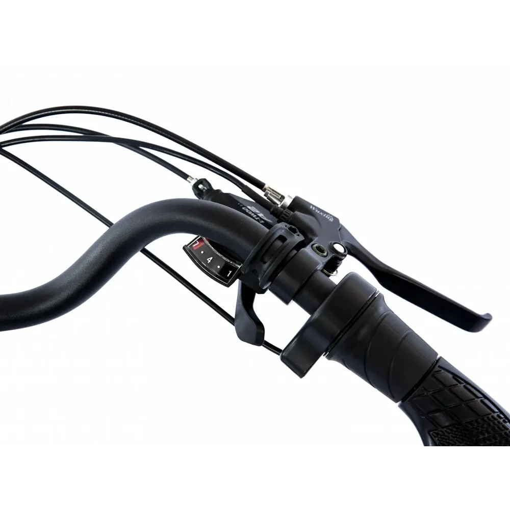 Складная конструкция рамы изготовлена из инновационного сплава алюминия, выдерживающего максимальные нагрузки. На подседельном штыре установлена батарея емкостью 8 А*ч. Штырь регулируется по высоте, рулевая часть электровелосипеда – по высоте и углу наклона. Переключение скоростей (7) проводится с помощью половинчатой ручки, размещенной на рулевой части.
