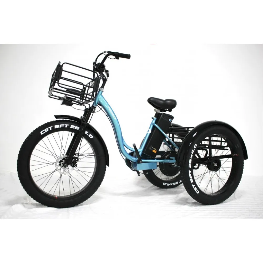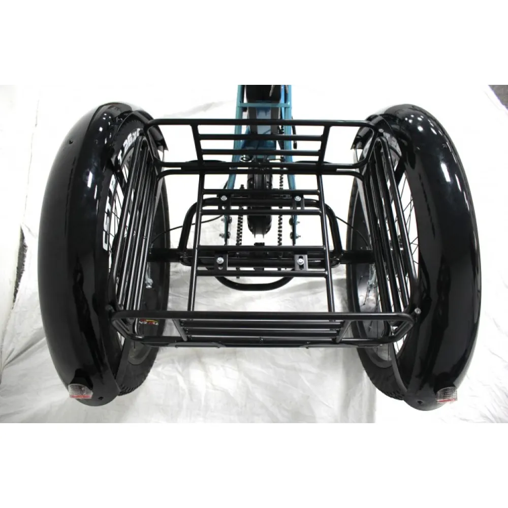 Технические характеристики электровелосипеда позволяют использовать его в пределах городской и сельской местности. Удобные корзины: передняя и задняя предназначены для транспортировки продуктов питания, рюкзака и других полезных для отдыха вещей.