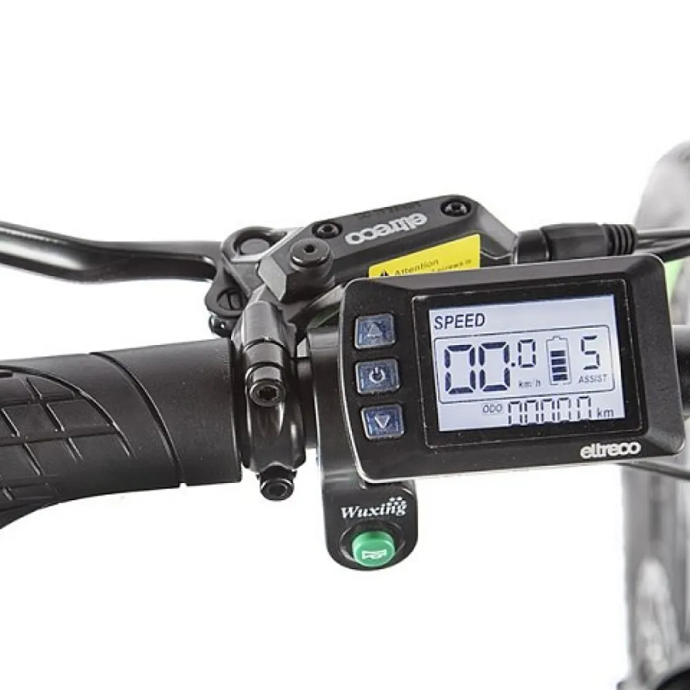 Колеса на Eltreco XT 850 new по размеру 27,5 дюйма. Такой диаметр колеса обеспечивает комфортное движение даже при неровностях и препятствиях. На переднем колесе установлен эксцентрик, поэтому его легко снять с вилки для удобства транспортировки. Имеется амортизирующая подвеска.