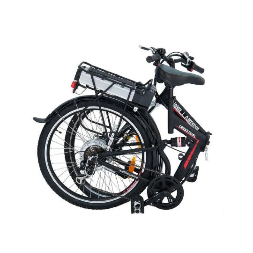 Электровелосипед Wellness CROSS RACK оборудован двигателем мощностью 750 Вт, он позволяет преодолевать большие расстояния и крутые подъемы. Максимальная скорость, развиваемая транспортным средством, составляет 40 км/ч. Аккумулятор емкостью 12 А*ч позволяет проехать на одном заряде свыше 40 км, в зависимости от режима движения.