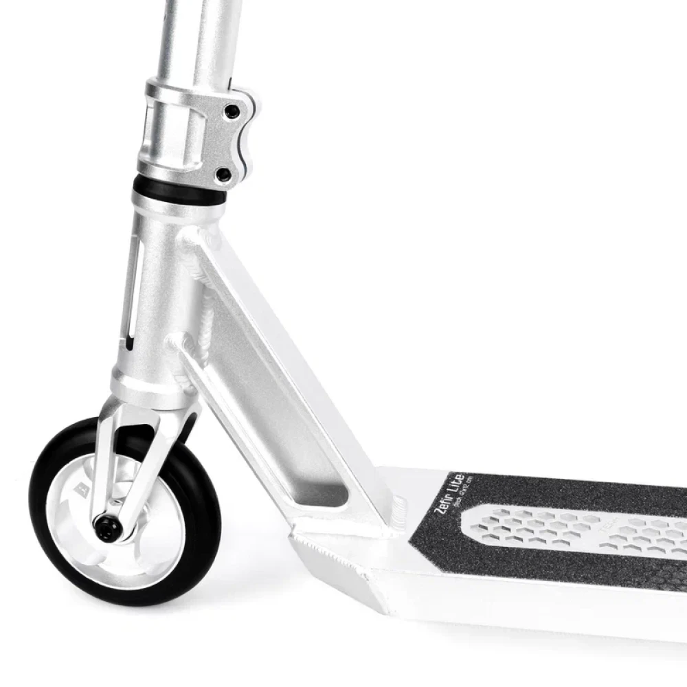 Комплектуется 110-миллиметровыми колесами, которые гарантируют отличное сцепление с поверхностью и плавное передвижение по скейтпаркам и уличным трассам. Черный цвет колес и серый цвет самоката создают неповторимый стиль и выделяют его среди других моделей.